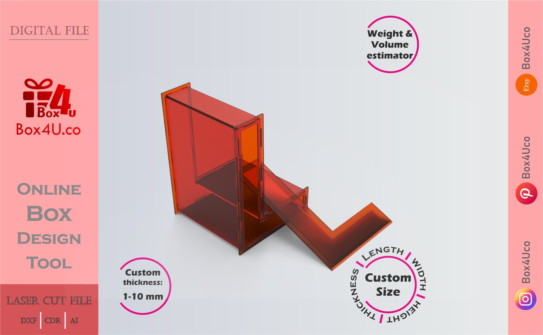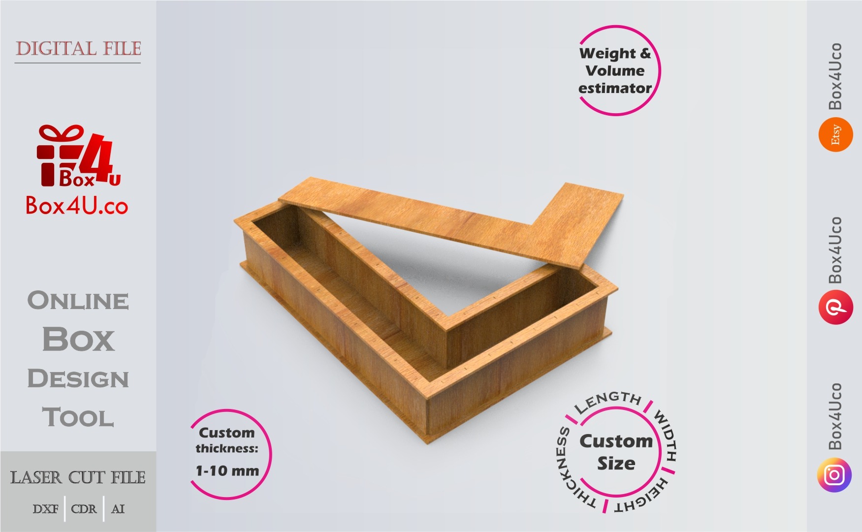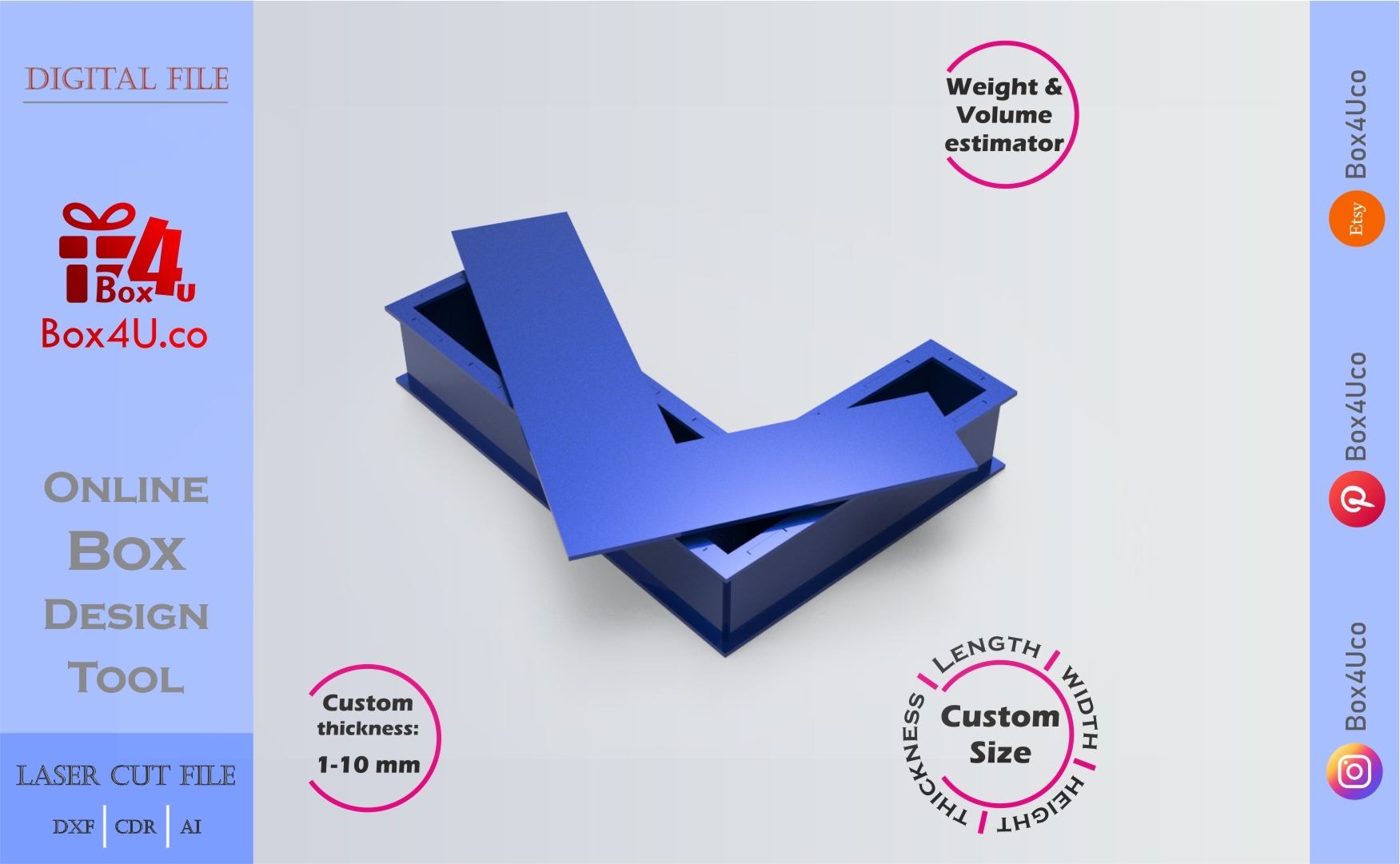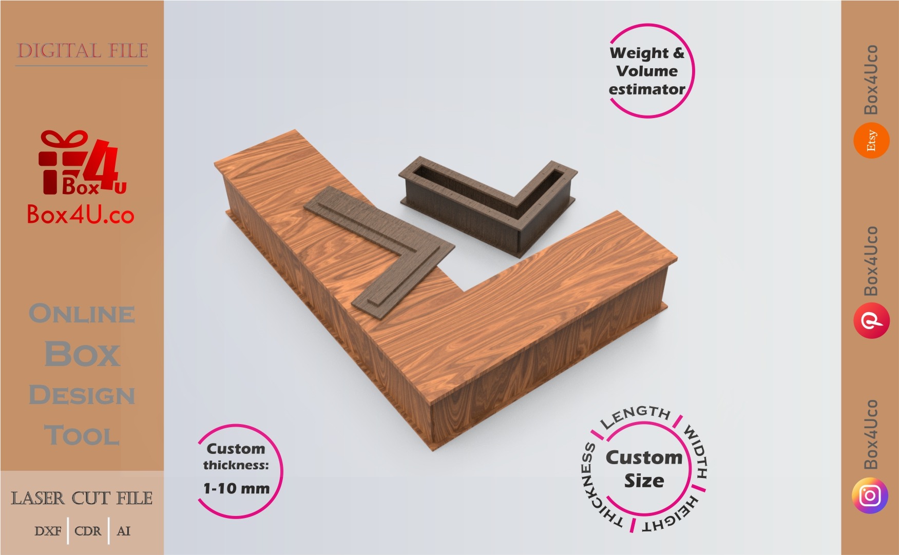 If you want to make a Letter L box quickly and easily, you’re in the right place. With our web application, you can use an interactive online design tool. This allows you to see your box in a 3D view, adjust its dimensions, and visualize your customizations instantly. You can create a unique box cut file that is perfect for laser cutting.