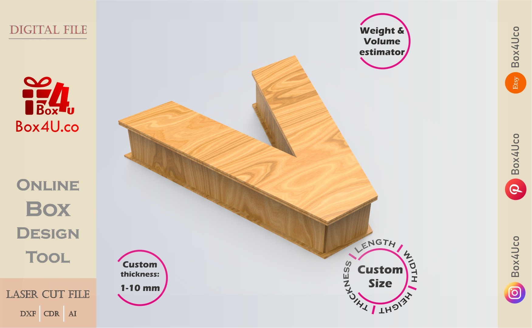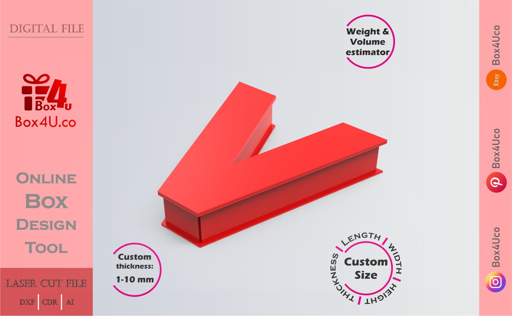 If you want to make a Letter V box quickly and easily, you’re in the right place. With our web application, you can use an interactive online design tool. This allows you to see your box in a 3D view, adjust its dimensions, and visualize your customizations instantly. You can create a unique box cut file that is perfect for laser cutting.