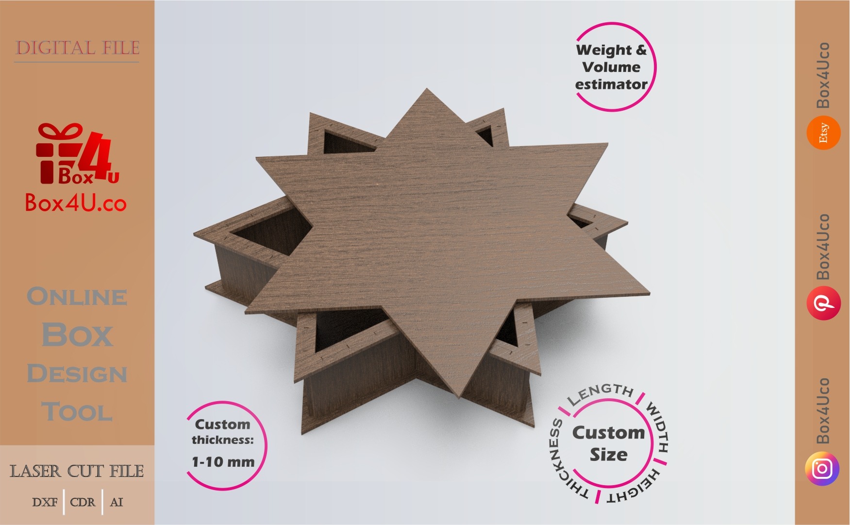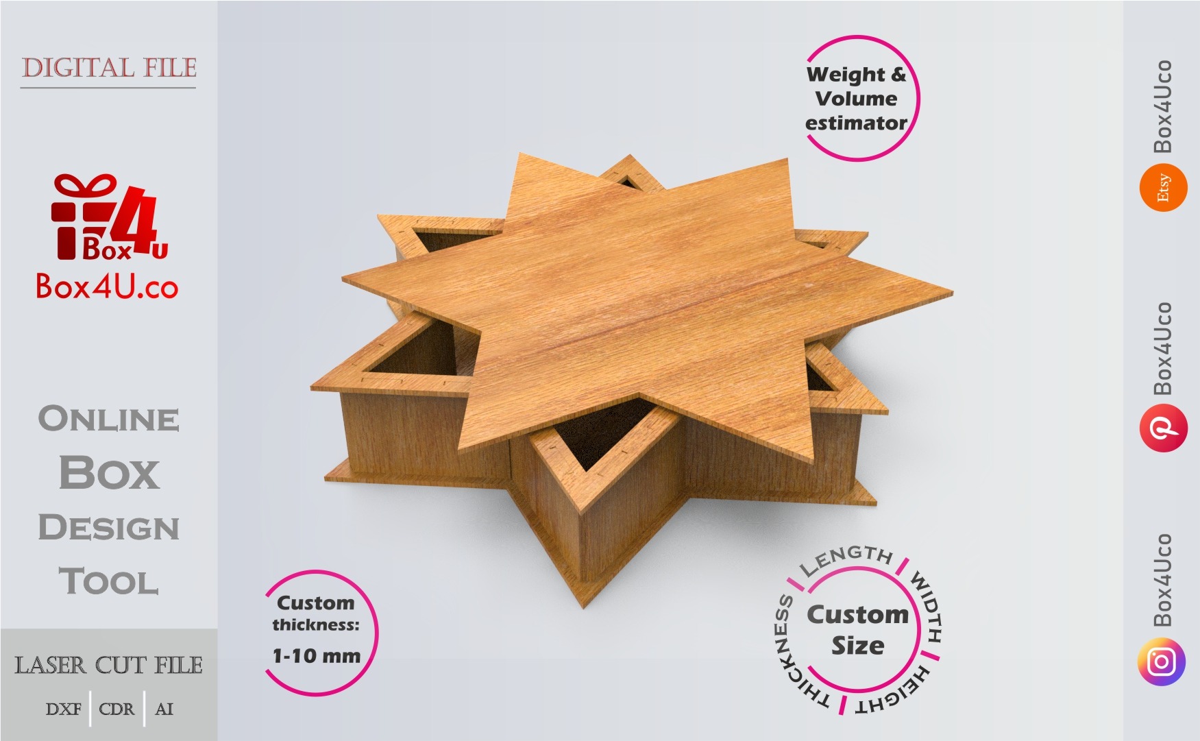 The process of creating your Six-pointed star box is simple and user-friendly. First, select the box design from our variety of options. Next, customize the dimensions, whether it’s for holding gifts, jewelry, or other small items. You can view your creation in 3D, allowing you to see exactly how the finished box will look. Once you’re satisfied, you can easily download the Six-pointed star box cut file in DXF format, ready for use with any laser cutting machine.