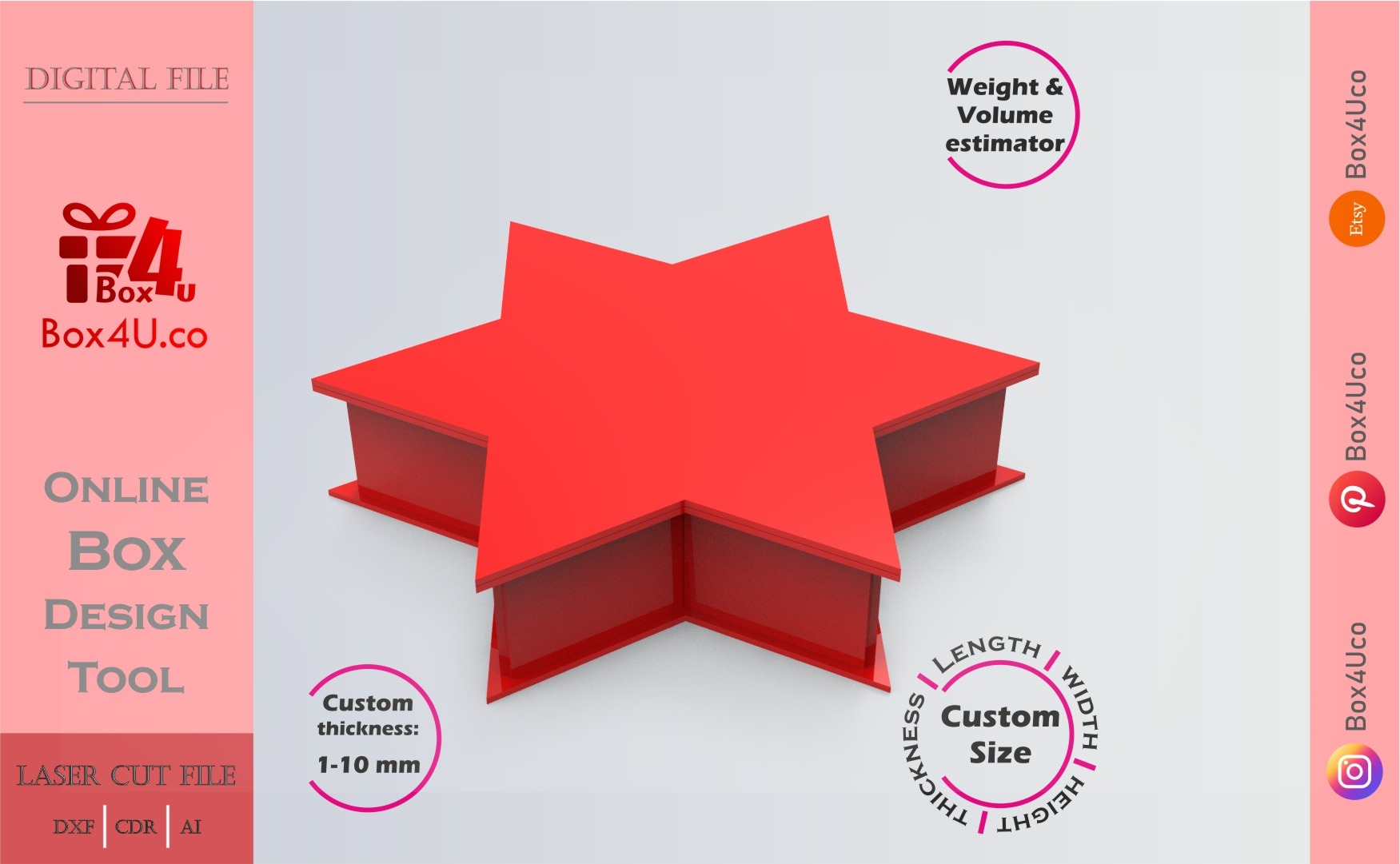 If you are looking to make a Six-pointed star box, our web application is the perfect tool for you. With the ability to fully customize the dimensions of your Six-pointed star box design, you can create a unique piece that fits your specific needs. Whether you’re designing a decorative item or a functional container, this shape is both versatile and eye-catching.